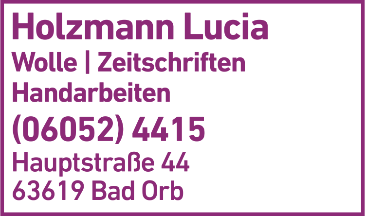 Die Adresse von Holzmann Lucia Handarbeiten lautet: Hauptstr. 44, 63619 Bad Orb