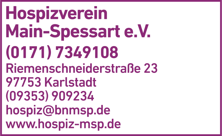 Die Adresse von Hospiz-Verein Main-Spessart e.V. lautet: Riemenschneiderstr. 23, 97753 Karlstadt