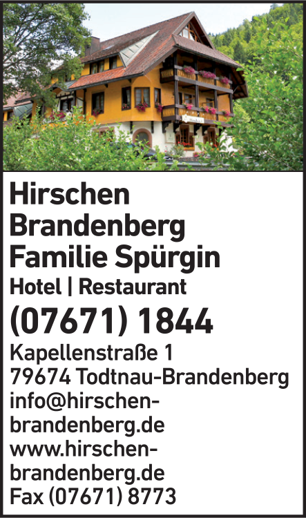 Die Adresse von Hotel Gasthaus Hirschen Todtnau - Brandenberg lautet: Kapellenstr. 1, 79674 Todtnau