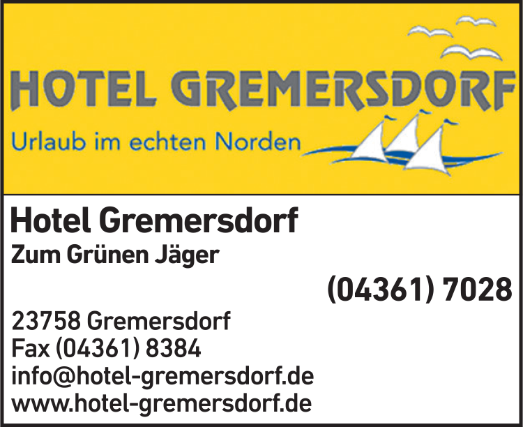 Die Adresse von Hotel Gremersdorf lautet: Am Hotel Gremersdorf 1, 23758 Gremersdorf