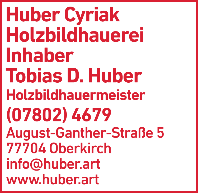 Die Adresse von Huber Cyriak Holzbildhauermeister lautet: August-Ganther-Str. 5, 77704 Oberkirch