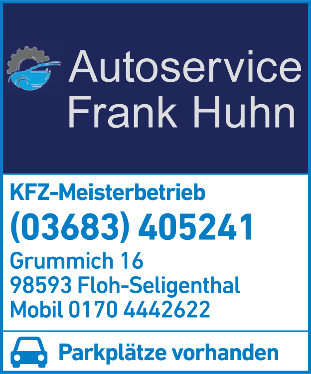 Die Adresse von Huhn Frank Autoservice, Reifenservice lautet: Grummich 16, 98593 Floh-Seligenthal