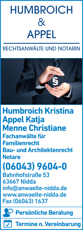 Die Adresse von Humbroich Kristina, Appel Katja & Menne Christiane Rechtsanwälte u. Notare lautet: Bahnhofstr. 53, 63667 Nidda