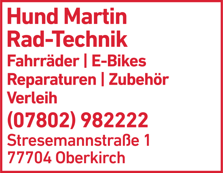 Die Adresse von Hund Martin Rad-Technik lautet: Stresemannstr. 1, 77704 Oberkirch