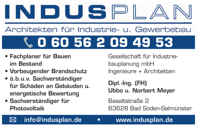 Die Adresse von INDUSPLAN - Gesellschaft für Industriebauplanung mbH Ingenieurbüro Architekten,ö.b.u.v. Sachverständige f. Gebäude,Energ... lautet: Basaltstr. 2, 63628 Bad Soden-Salmünster