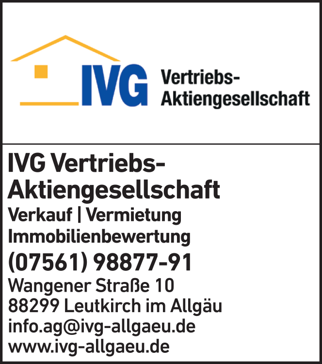 Die Adresse von IVG Vertriebs-Aktiengesellschaft lautet: Wangener Str. 10, 88299 Leutkirch im Allgäu