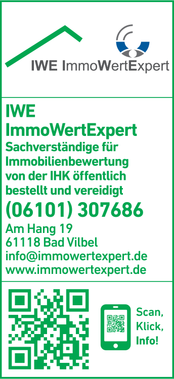 Die Adresse von IWE ImmoWertExpert lautet: Am Hang 19, 61118 Bad Vilbel