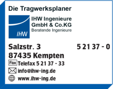 Die Adresse von Ingenieure IHW Ingenieure GmbH & Co. KG lautet: Salzstr. 3, 87435 Kempten