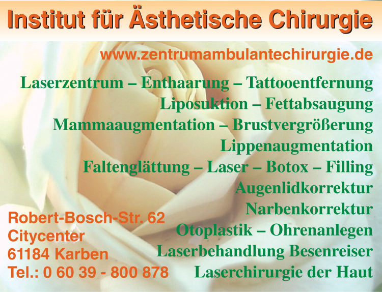 Institut für Ästhetische Chirurgie 06039 80 08 78 Karben Robert-Bosch-Str. 62 61184 Kloppenheim