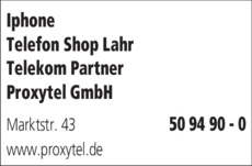 Die Adresse von Iphone, Proxytel GmbH lautet: Marktstr. 43, 77933 Lahr