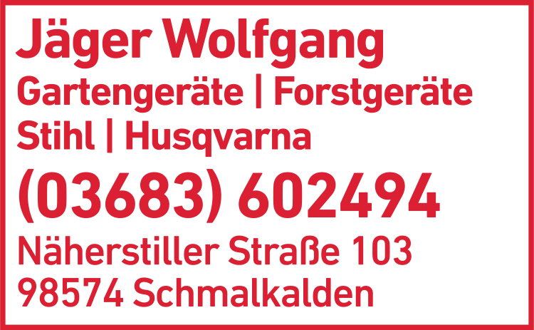 Die Adresse von Jäger Wolfgang Garten- und Forstgeräte lautet: Näherstiller Str. 103, 98574 Schmalkalden