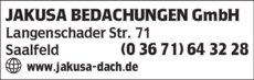 Die Adresse von JAKUSA Bedachungen GmbH lautet: Langenschader Str. 71, 07318 Saalfeld