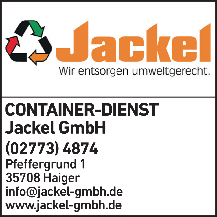 Die Adresse von Jackel GmbH Containerdienst u. Abfallbeseitigung lautet: Pfeffergrund 1, 35708 Haiger