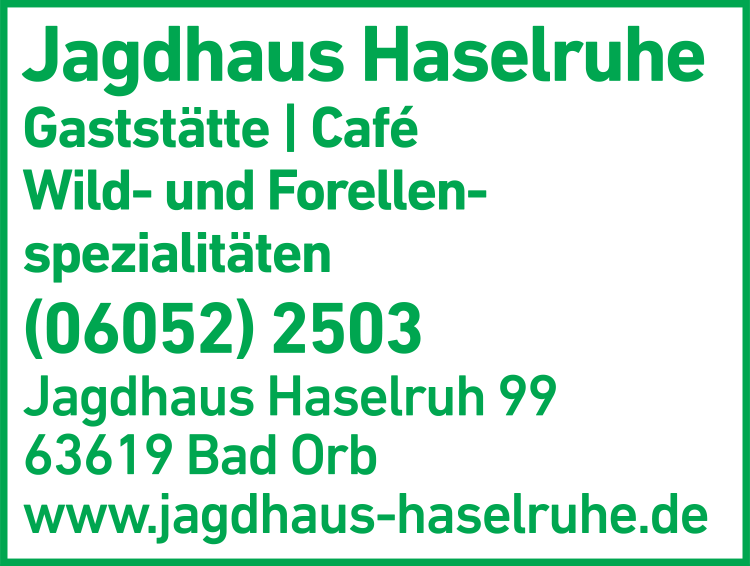 Die Adresse von Jagdhaus Haselruhe Gaststätte lautet: Haselstr., 63619 Bad Orb