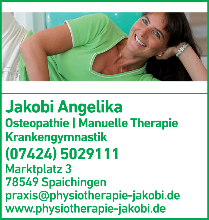 Die Adresse von Jakobi Angelika Physiotherapie u. Osteopathie lautet: Marktplatz 3, 78549 Spaichingen