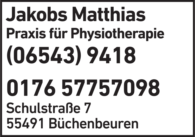 Die Adresse von Jakobs Matthias Krankengymnastik lautet: Schulstr. 7, 55491 Büchenbeuren