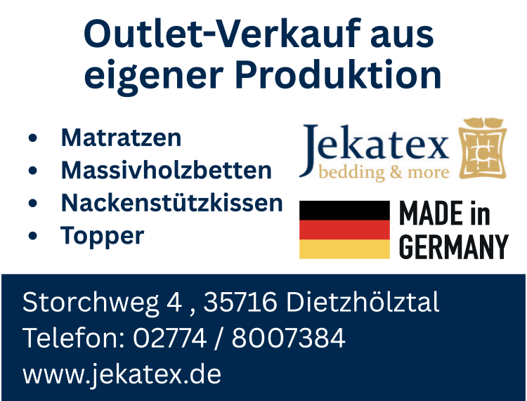 Die Adresse von Jekatex bedding & more, Carsten Hansmann Einzelgesellschaft lautet: Storchweg 4, 35716 Dietzhölztal