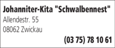 Die Adresse von Johanniter-Kita "Schwalbennest" lautet: Allendestr. 55, 08062 Zwickau