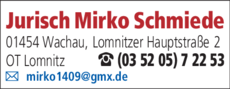 Die Adresse von Jurisch Mirko Schmiede lautet: Lomnitzer Hauptstr. 2, 01454 Wachau