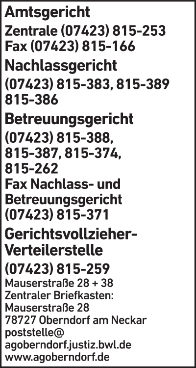 Die Adresse von Justizbehörden Oberndorf lautet: Mauserstr. 28, 78727 Oberndorf am Neckar
