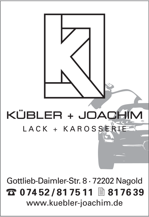 Die Adresse von Kübler Thomas + Joachim Maler lautet: Gottlieb-Daimler-Str. 8, 72202 Nagold