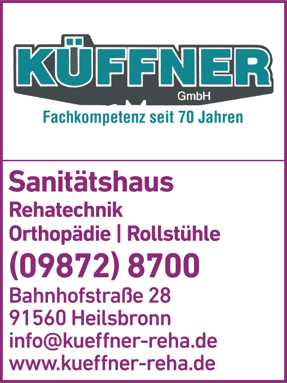 Die Adresse von Küffner Sanitätshaus lautet: Bahnhofstr. 28, 91560 Heilsbronn