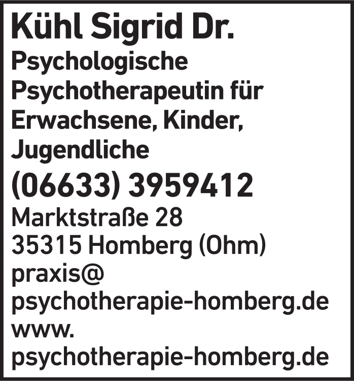 Die Adresse von Kühl Sigrid Psychotherapeutische Praxis für Kinder, Jugendliche, Erwachsene lautet: Marktstr. 28, 35315 Homberg (Ohm)