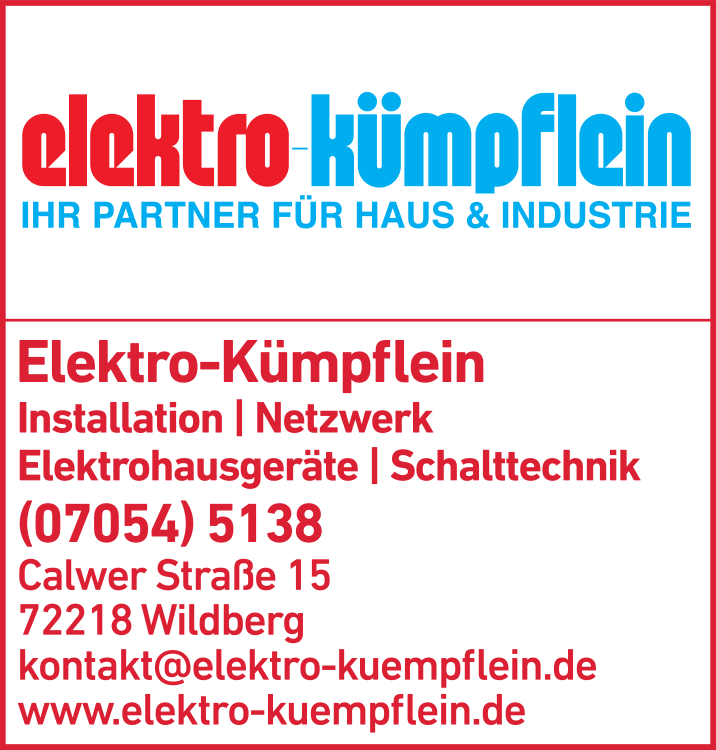 Die Adresse von Kümpflein Elektro lautet: Calwer Str. 15, 72218 Wildberg