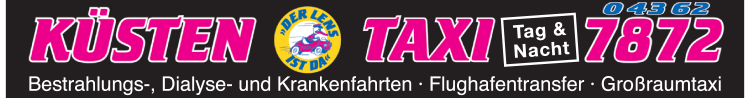 Küsten-Taxi hat montags bis sonntags von 00:00 - 24:00 Uhr geöffnet.