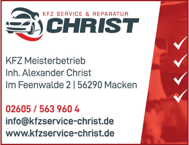 Die Adresse von KFZ-Service Christ lautet: Im Feenwalde 2, 56290 Macken
