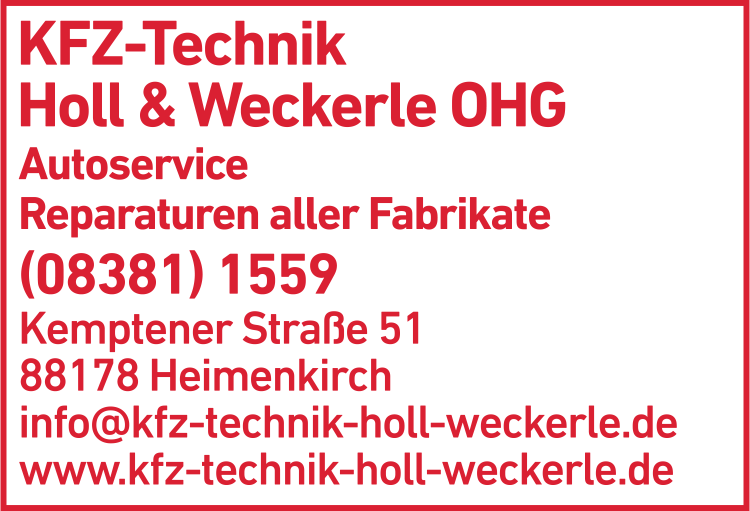 Die Adresse von KFZ-Technik Holl & Weckerle OHG Autowerkstatt, Kfz-Werkstatt lautet: Kemptener Str. 51, 88178 Heimenkirch