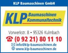 Die Adresse von KLP Baumaschinen GmbH lautet: Vorwerkstr. 8, 95326 Kulmbach
