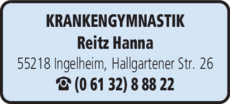 Die Praxis für Krankengymnastik Hanna Reitz in Ingelheim steht Ihnen als vertrauensvoller Ansprechpartner bei Schmerzen am Rücken und den Gelenken, bei Muskelverspannungen, Funktionsstörungen und Bewegungseinschränkungen zur Seite und bietet individuelle Behandlungen auf hohem Fachniveau. Der persönliche Kontakt und das Vertrauen der Patienten liegen der Therapeutin sehr am Herzen. Gemeinsam mit Ihnen erarbeitet Hanna Reitz einen auf Ihre Beschwerden zugeschnittenen Behandlungsplan, um so Ihre Gesundheit wieder herzustellen. Das Therapieangebot umfasst zum Beispiel die Physiotherapie und die Krankengymnastik, Massagen, die Physiotherapie auf neurophysiologischer Basis und die Wirbelsäulengymnastik. Aber auch die Fußreflexzonentherapie, beispielsweise bei rheumatischen Erkrankungen, gehört zum umfangreichen Behandlungsangebot der Praxis. Es erwartet Sie eine ruhige, einladende Praxisatmosphäre.