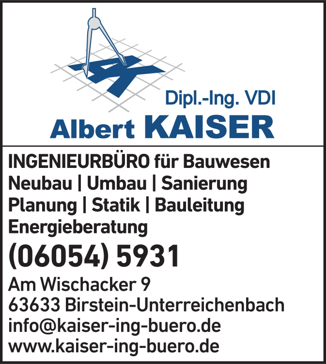 Die Adresse von Kaiser Albert Dipl. - Ing. Ingenieurbüro für Bauwesen lautet: Am Wischacker 9, 63633 Birstein