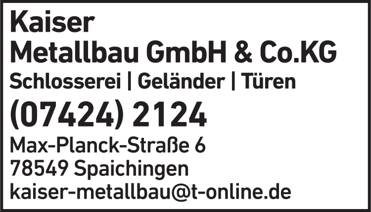 Die Adresse von Kaiser Metallbau GmbH & Co.KG lautet: Max-Planck-Str. 6, 78549 Spaichingen