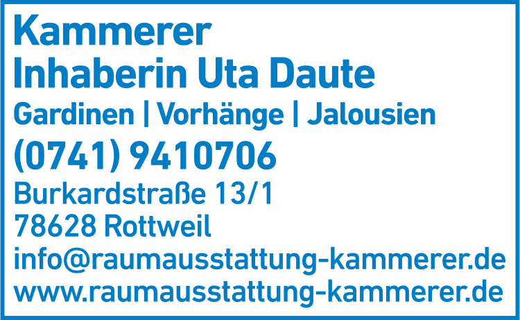 Die Adresse von Kammerer Raumgestaltung lautet: Burkardstr. 13/1, 78628 Rottweil