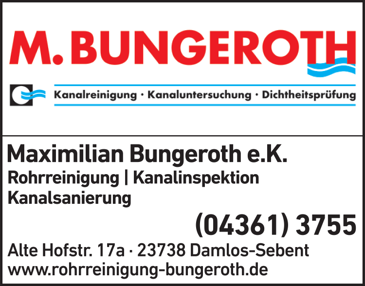 Die Adresse von Kanalreinigung Bungeroth Maximilian Bungeroth e.K. lautet: Alte Hofstr. 17 a, 23738 Damlos-Sebent