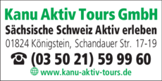 Die Adresse von Kanu Aktiv Tours GmbH lautet: Schandauer Str. 17-19, 01824 Königstein