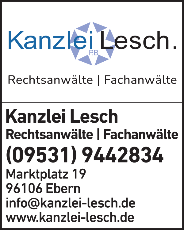 Die Adresse von Kanzlei Lesch Rechtsanwalt lautet: Marktplatz 19, 96106 Ebern