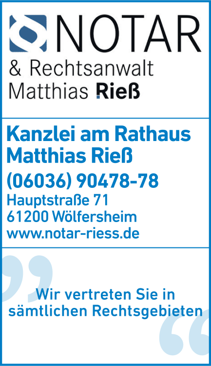 Die Adresse von Kanzlei am Rathaus Rieß Matthias Notar und Rechtsanwalt lautet: Hauptstr. 71, 61200 Wölfersheim