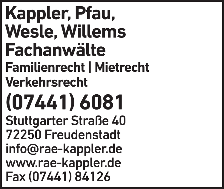 Die Adresse von Kappler-Pfau-Wesle-Willems Rechtsanwälte lautet: Stuttgarter Str. 40, 72250 Freudenstadt