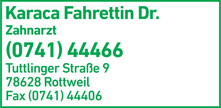 Die Adresse von Karaca Fahrettin Dr. Zahnarzt lautet: Tuttlinger Str. 9, 78628 Rottweil