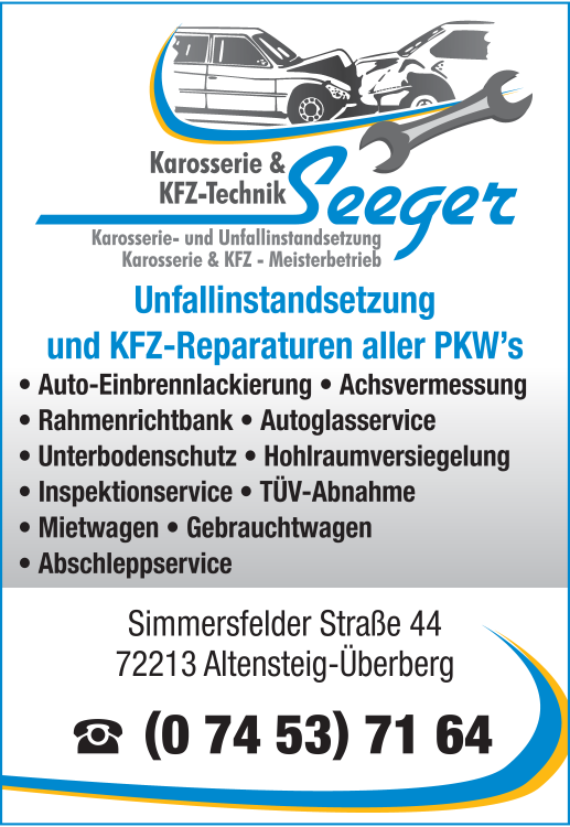 Karosserie & KFZ-Technik Seeger 07453 71 64 Altensteig Simmersfelder Str. 44 72213 Überberg 5 5 1