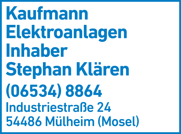 Die Adresse von Kaufmann Elektroanlagen lautet: Industriestr. 24, 54486 Mülheim an der Mosel
