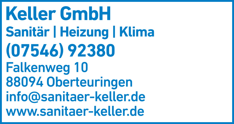 Die Adresse von Keller GmbH Sanitär - Heizung - Klima lautet: Falkenweg 10, 88094 Oberteuringen