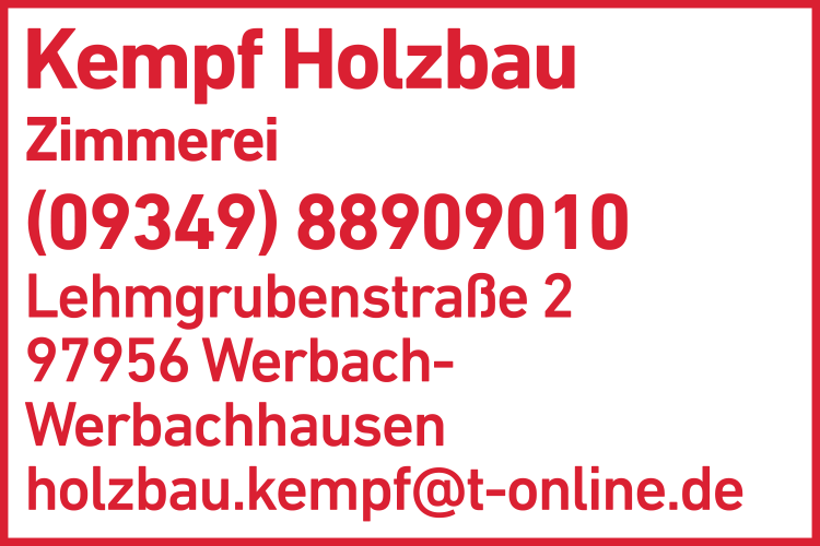 Die Adresse von Kempf Holzbau lautet: Lehmgrubenstr. 2, 97956 Werbach
