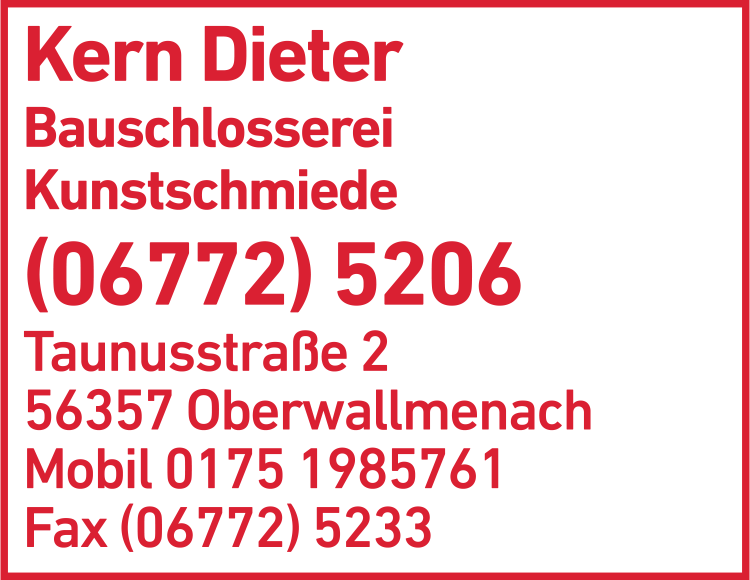 Die Adresse von Kern Dieter Kunstschmiede lautet: Taunusstr. 2, 56357 Oberwallmenach