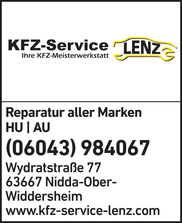 Die Adresse von Kfz-Service Lenz - Inh. Tobias Lenz lautet: Wydratstr. 77, 63667 Nidda-Ober-Widdersheim