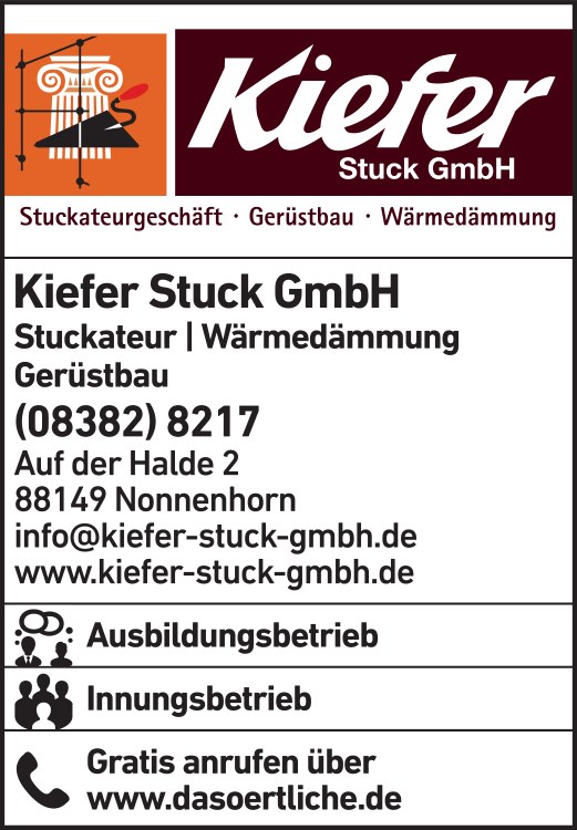 Die Adresse von Kiefer Stuck GmbH lautet: Auf der Halde 2, 88149 Nonnenhorn