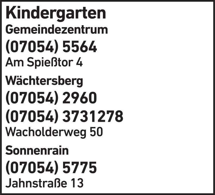 Die Adresse von Kindergarten Gemeindezentrum lautet: Am Spießtor 4, 72218 Wildberg